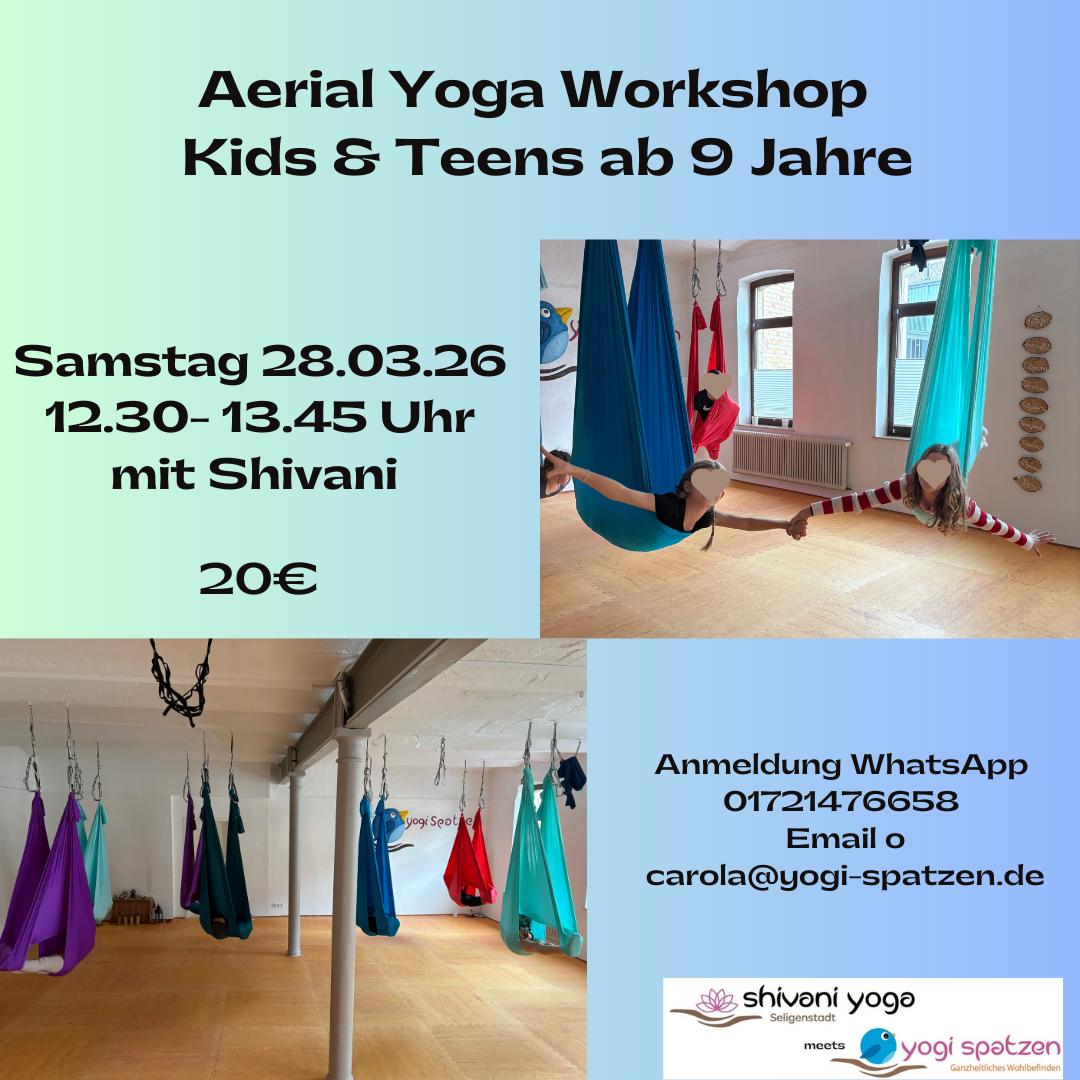 Lust auf etwas ganz Besonderes? In diesem Workshop entdecken Kinder und Jugendliche die Magie des Aerial Yoga – schwebend im Tuch, mit viel Spaß, Mut und Bewegung! Spielerisch stĂ€rken wir KörpergefĂŒhl, Selbstvertrauen und innere Ruhe. Ob kopfĂŒber hĂ€ngen, wie ein Schmetterling fliegen oder im Tuch entspannen – hier darf man einfach Kind sein und ĂŒber sich hinauswachsen.